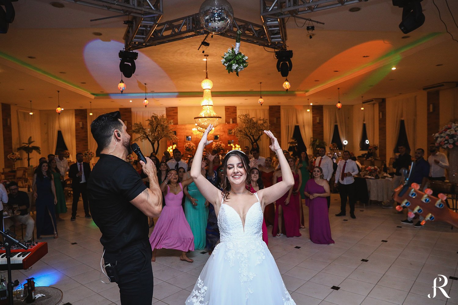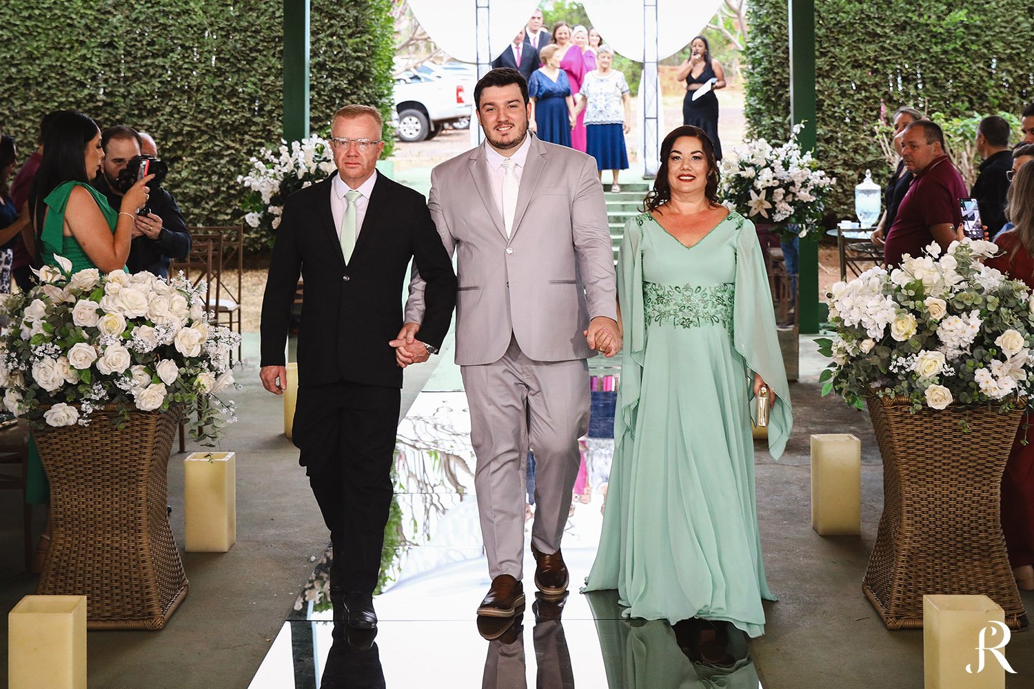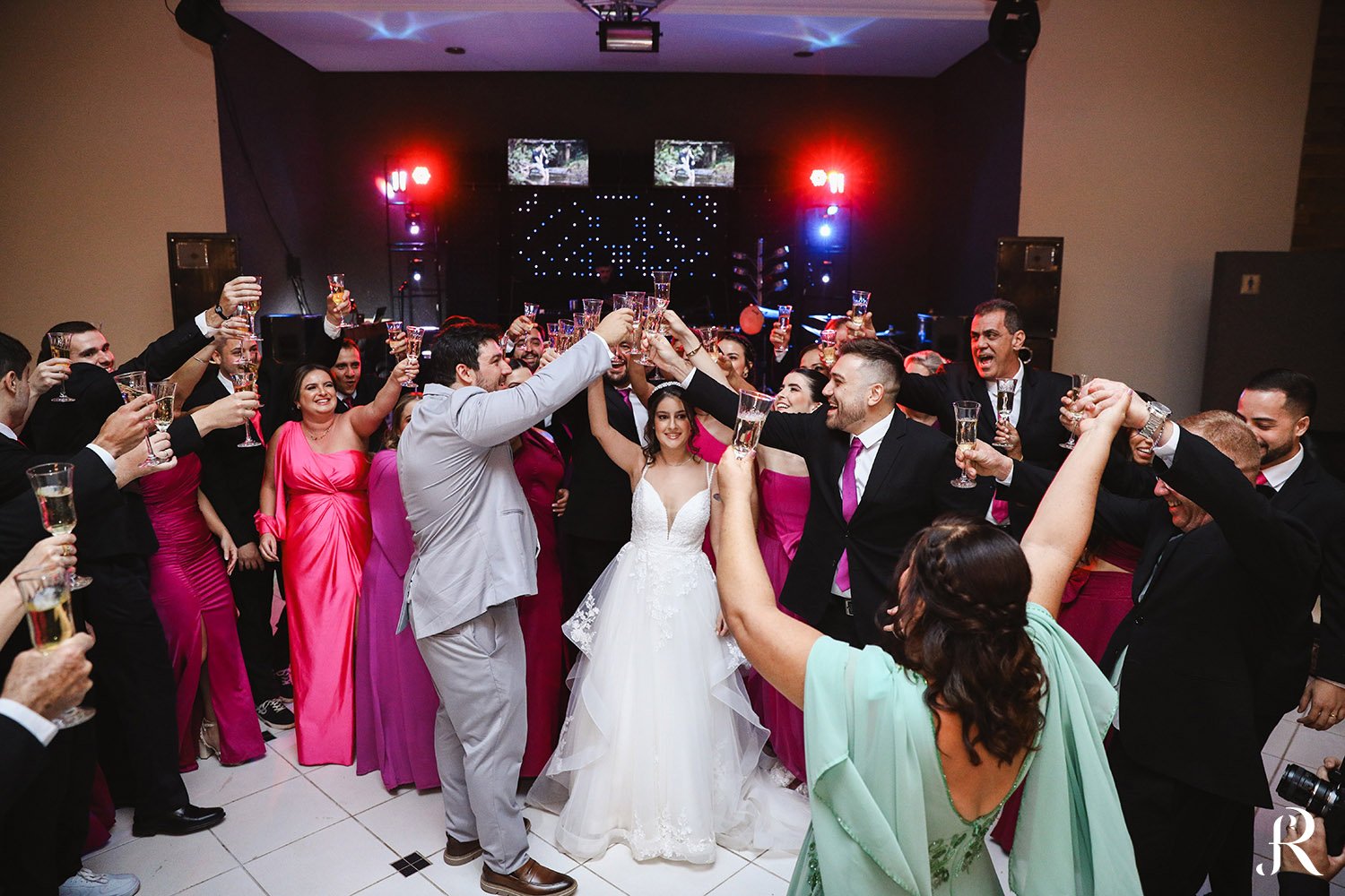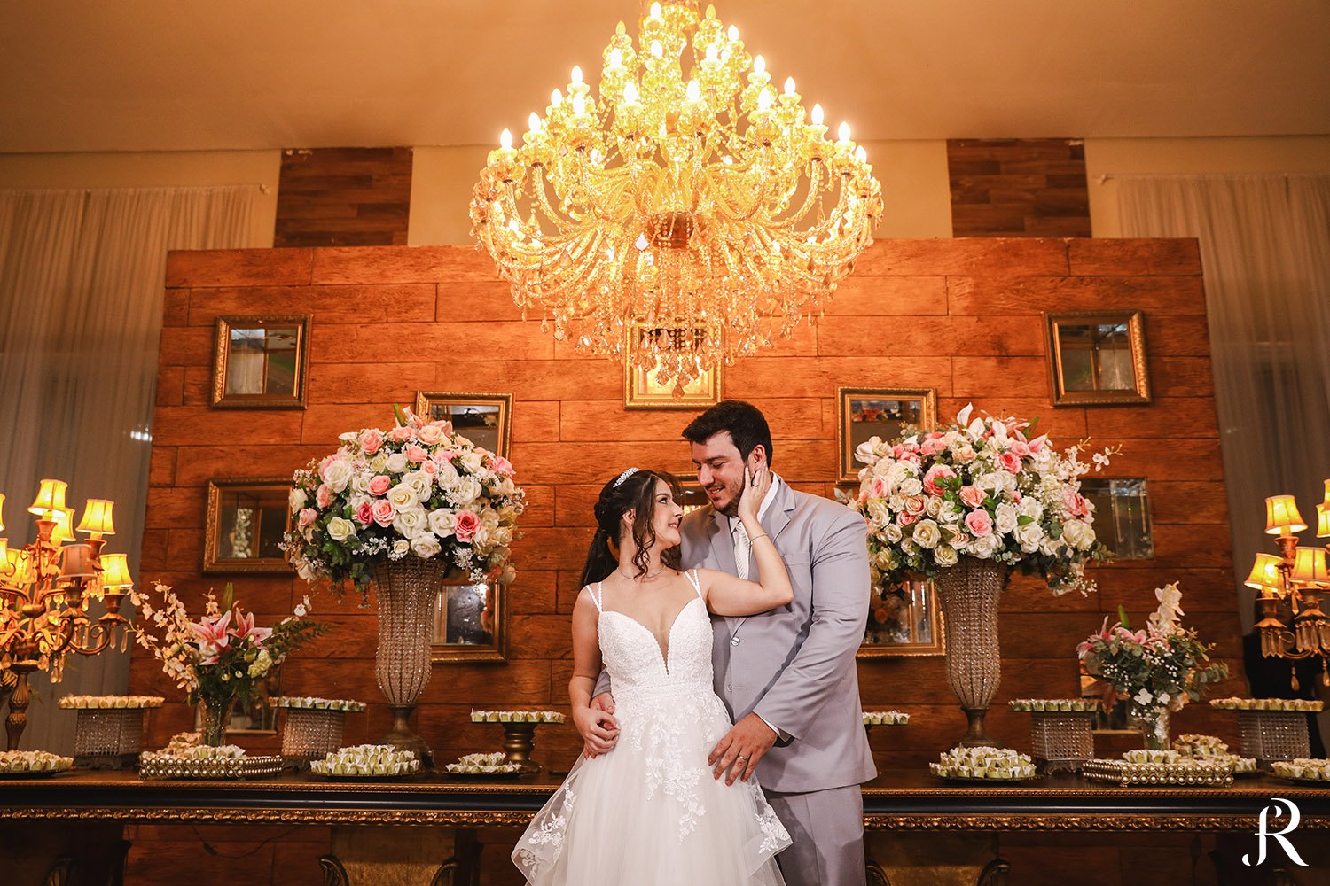 Após a cerimônia, os convidados seguiram para o salão, onde aconteceu a recepção. O ambiente foi preparado com muito cuidado para proporcionar conforto e alegria a todos. Entre brindes, abraços e muita animação, a festa seguiu com energia contagiante, celebrando o início de uma nova etapa na vida dos noivos.